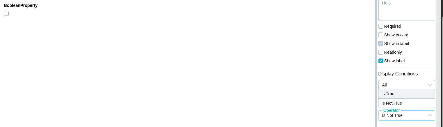 - You can now use Display Condition on a Boolean property toggling between operators Is True/Is Not True. (Preview)